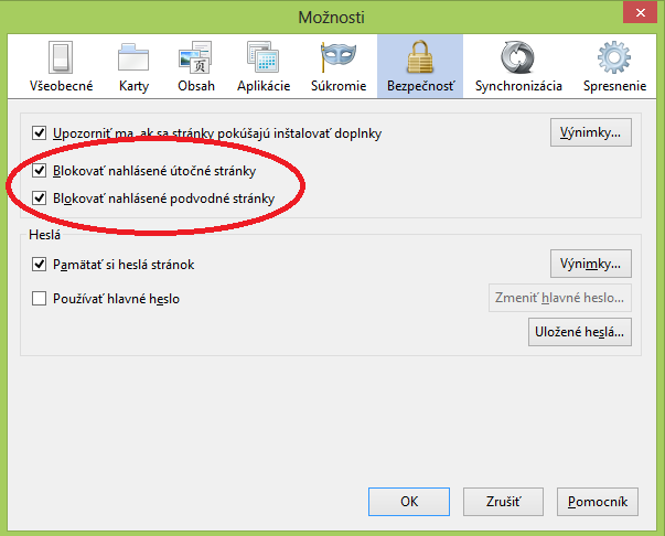 - v Firefox 28 a vyššom cez menu Nástroje/Možnosti/záložka Bezpečnosť vybrať voľby