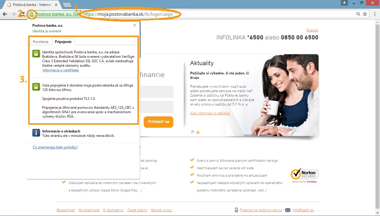 - Overte platnosť šifrovacieho certifikátu kliknutím na "zámoček" a skontrolovaním vydavateľa Geo Trust a cieľového servera servera "moja.postovabanka.sk"